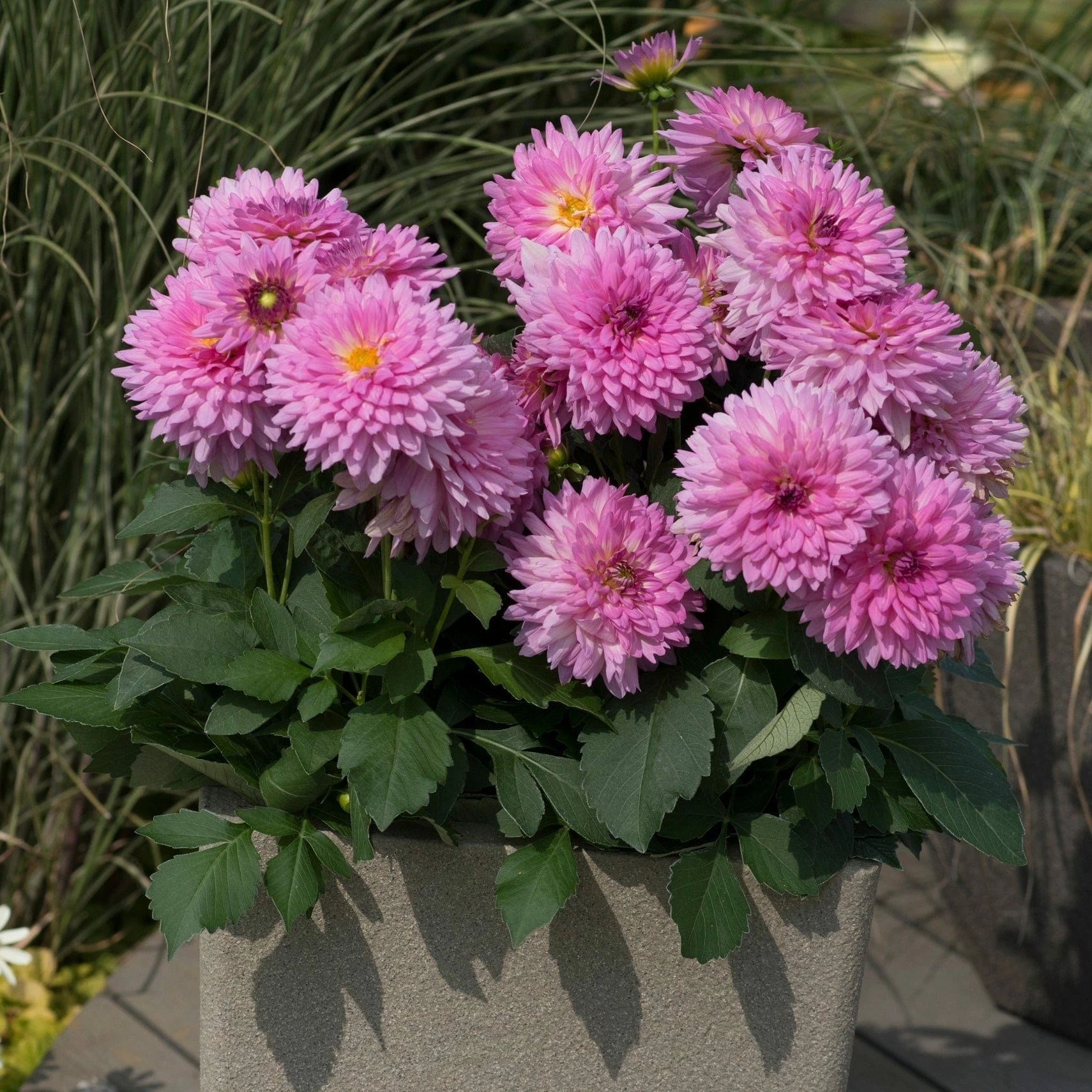 - Big, bold purple-pink pompoms with sunny yellow centres – the classic Dahlia!